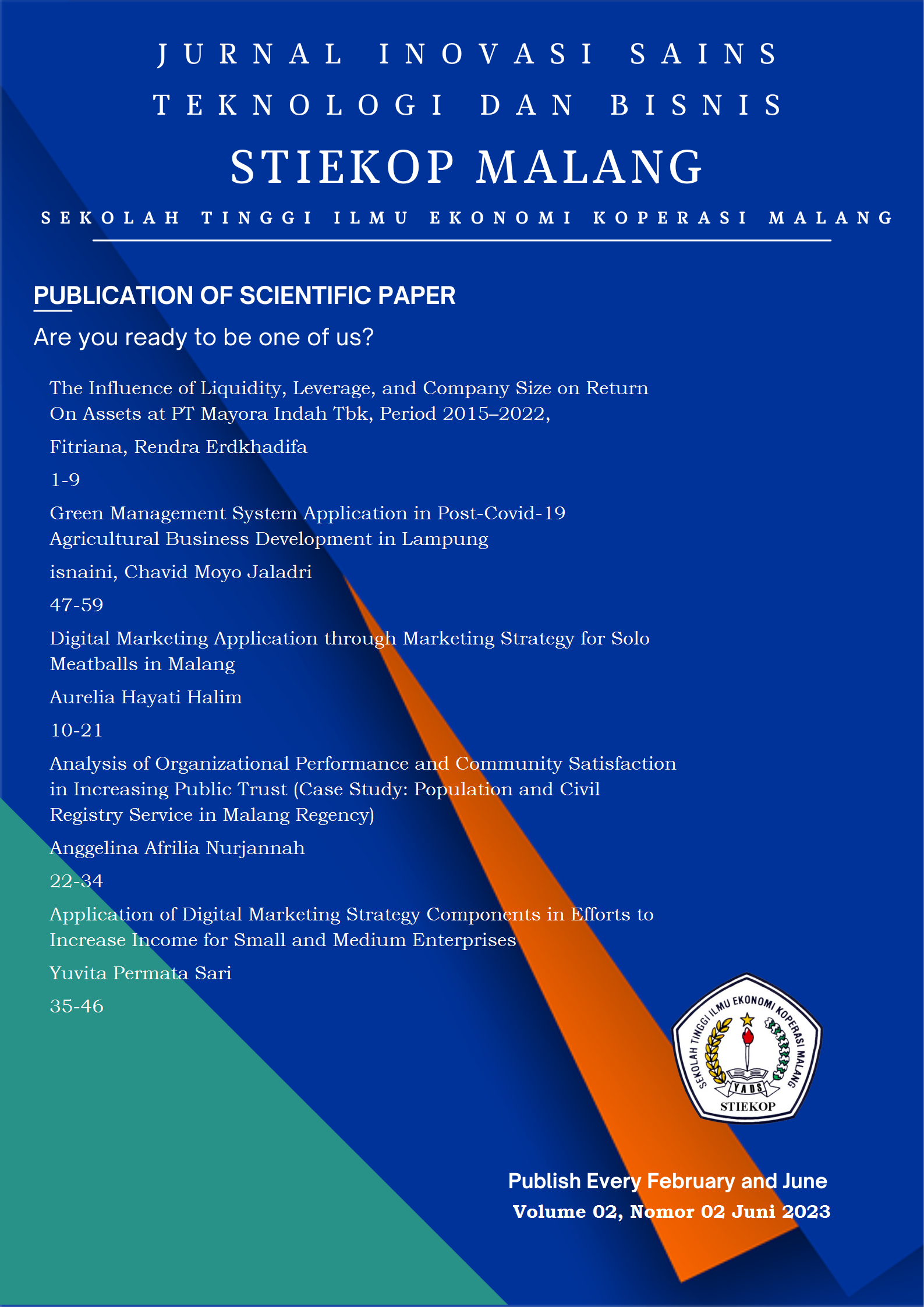 Vol 2 No 02 (2023)Jurnal Inovasi Sains Teknologi Dan Bisnis (JISTB) bertujuan untuk menjadi media penyebarluasan hasil penelitian, pengembangan kreatifitas ide dan inovasi yang bersifat ilmiah di bidang Sosial, teknologi, Sains, dan bisnis di kalangan akademisi lingkungan STEIKOP, Praktisi internasional, praktisi, pengatur kebijakan, mahasiswa dan untuk kalangan umum.