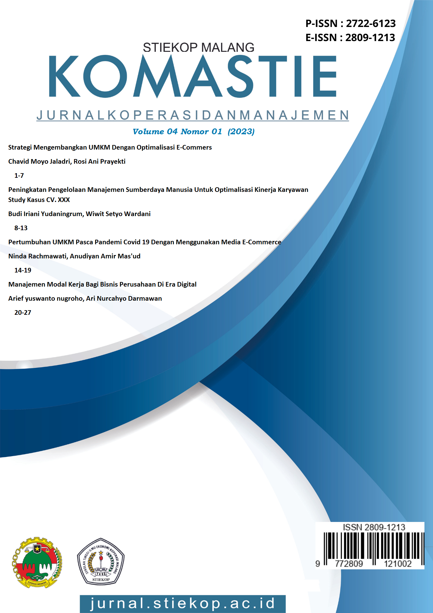 Vol 4 No 01 (2023)Journal Koperasi dan Manajemen (KOMASTIE) bertujuan untuk menjadi media penyebarluasan hasil penelitian dan pertukaran karya ilmiah bidang Ekonomi, Manajemen, dan Koperasi di kalangan akademisi lingkungan STIEKOP, Prektisi internasional, praktisi, pengatur kebijakan, dan untuk kalangan umum.